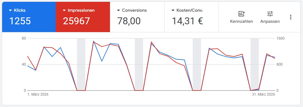 Eine Physiotherapie aus der Nähe von Nürnberg hat mich im Oktober 2025 kontaktiert. Das Ziel bestand darin, mehr Conversions zu generieren und die Struktur im Google-Ads-Account zu optimieren. Zudem wollten wir durch Testphasen die Best Practices in Erfahrung bringen, da das Unternehmen nur wenige Berührungspunkte mit Google Ads hatte.